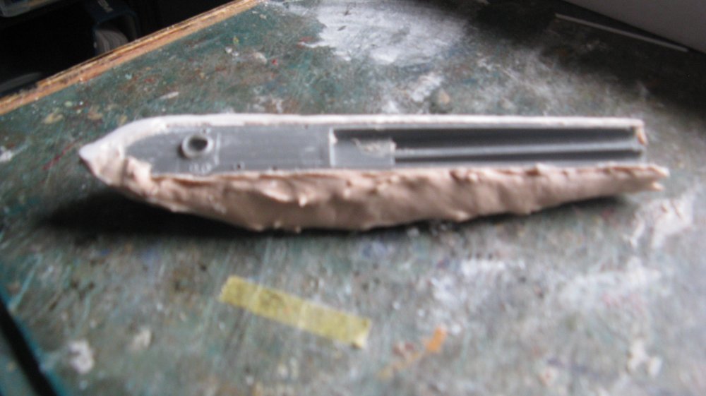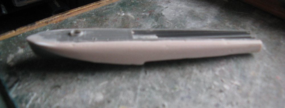 Some masking tape was added to the upper hull and then I used car body filler to reshape the hull. The masking tape was removed while the filler was still soft. This left a narrow strip that I used as a guide to sand to when reshaping the hull topsides.