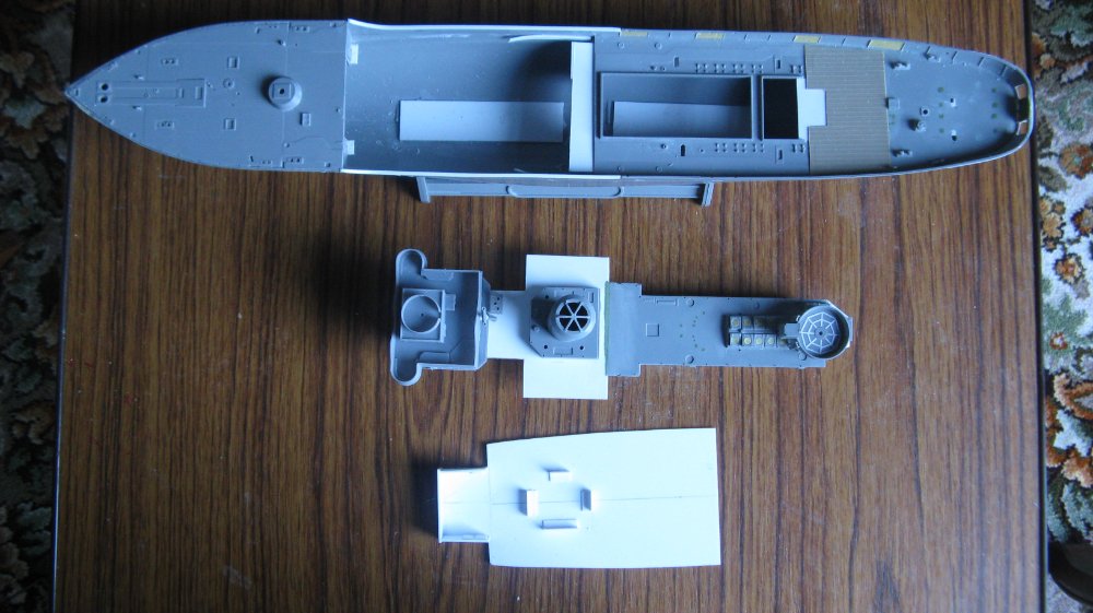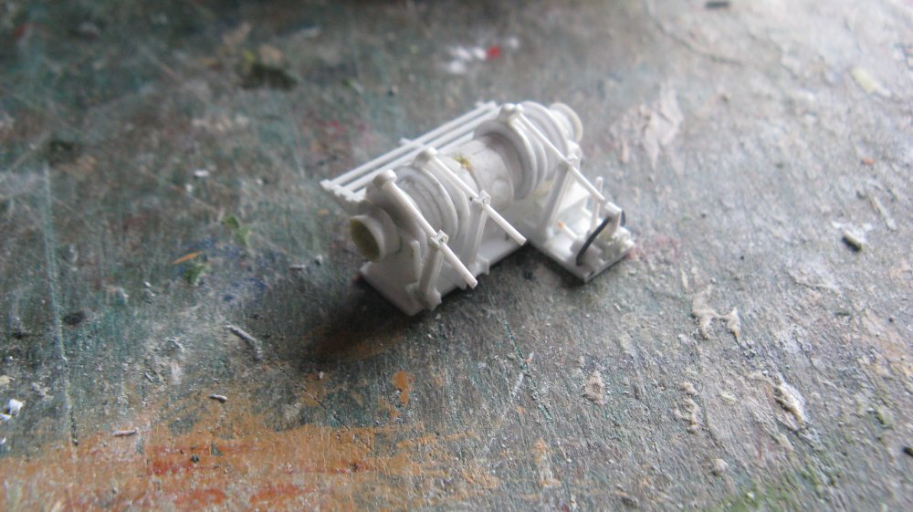 Found the L,Arsenal bridge set online so sent for that. In the meantime, glued the hull together and looking at photos and decided to take out some of the flare on the bows. Did this with a bit of plasti-card and milliput. Still not got the courage to cut the hull up so did some more research. Found an article by someone called “Captain Brown”. Lots of information on a 1/72 build. After reading through it decided to build the minesweeping gear before cutting into the hull as there were still options open to me without cutting. I used the winch gear left over from the Revell North Sea Trawler I'm converting to an Admiralty Class Trawler as the starting point