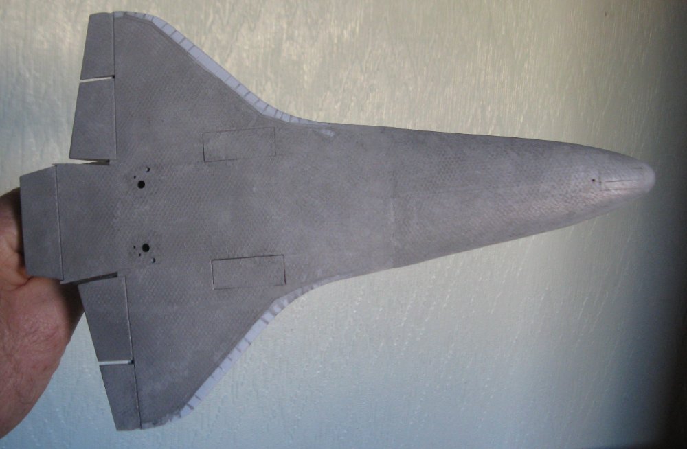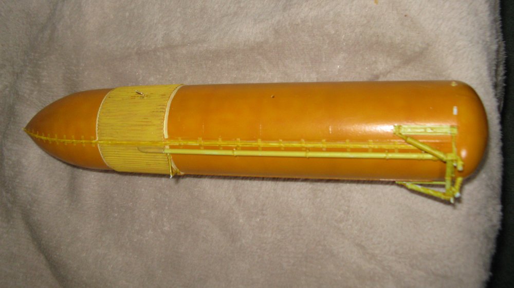 Ribbing added to the external tank (ET) and the rest of tank textured by using liquid poly cement to give a rough foam appearance. ET now painted with a mix of yellow/mustard paint.