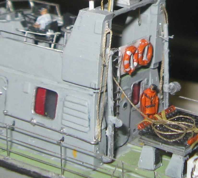 The hull was mounted onto a building stand and the superstructure added after first painting the enclosed control room and adding windows. Curtains added on the crew windows to the rear of the superstructure. The rescue dummy was added to the rear superstructure