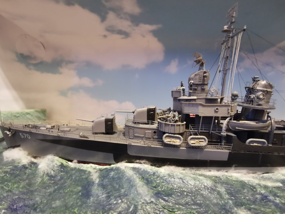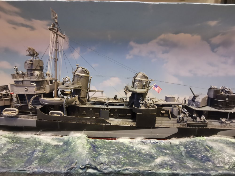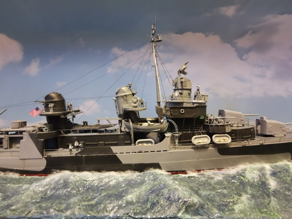 Well it's taken 2 years off and on but I'm calling it finished. Picked it up at Trains4you when it was on special offer. I had started to build an escort carrier (which is still ongoing) and had found & purchased some bofors guns for it After some research I decided to use the said guns & build the Charles Ashburne by replacing the forward 20mm, s with twin 40mm & adding 2 more midship 40mm mounts and adding extra 20mm,s to the stern & moving the searchlights to the forward funnel.