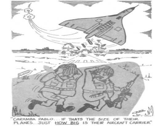 The ground is not yet completely secure, deminers have just finished checking whether the wreckage of an Argentine plane, a ground attack Pucara, destroyed by the men of the SAS Regiment and left as a decoy on the edge of the runway, is not trapped, and an armored vehicle of the Blues and Royals ensures our protection against a possible coup of the Argentine soldiers.