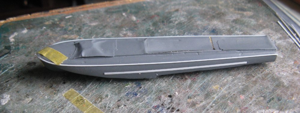 Some masking tape was added to the upper hull and then I used car body filler to reshape the hull. The masking tape was removed while the filler was still soft. This left a narrow strip that I used as a guide to sand to when reshaping the hull topsides.