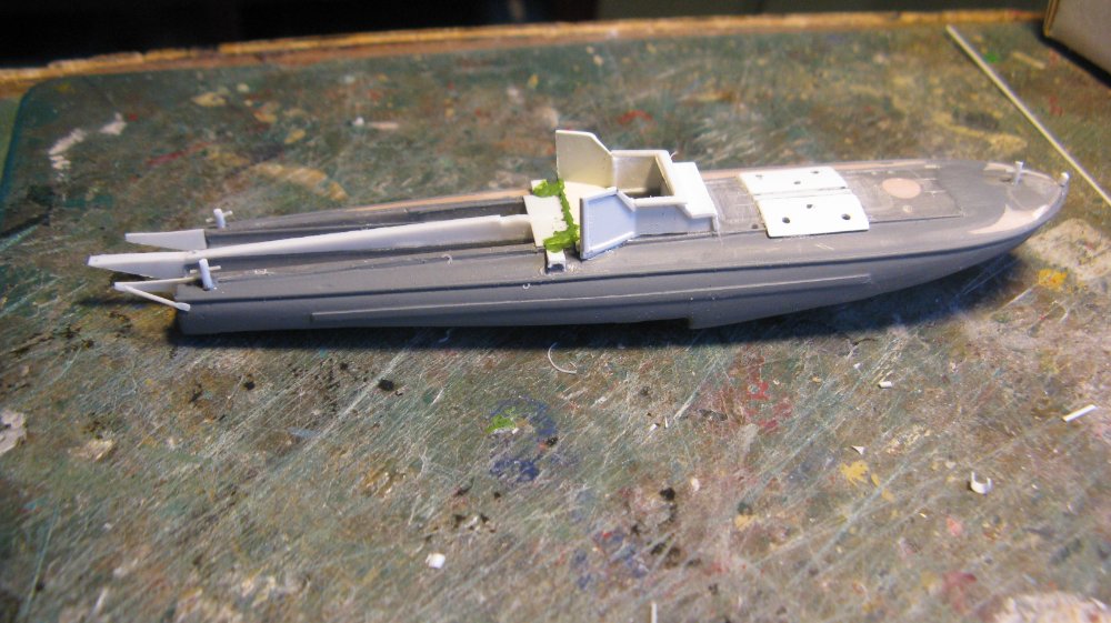 The gunner's position on the bow was cut off and filled as the boat I was doing has separate intake cowls on the bow not the big air scoop. The bridge was then made and then what I assume are the torpedo guides at the stern
