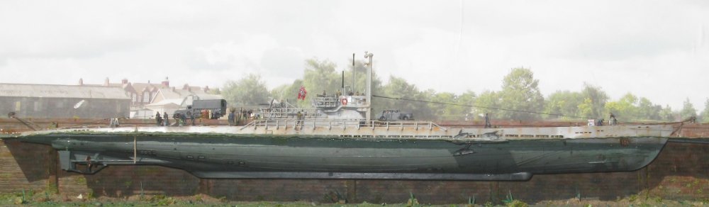 Just received the new Revell type IX U-Boat. Apart from some rather heavy hull side detail looks very nice. Might try a different way of displaying the model by mounting it on a base, full hull, but adding a “Faller” water line surface, plus “Germania Figurens” deck crew. (As posted by “TeddyBeer”) I got started by drilled the handrail stanchions holes for replacement thinner handrails, then the messy part opening the hull flooding vents by thinning the plastic from the inside. (Did that overlooking Keswick on a nice warm afternoon while waiting for my grandson No.2 on a school project.) (Only did the most obvious vents). Next was to work out the base dimensions and layout. Once the basic base was constructed the hull was drilled in the side to take 2 lengths of Perspex rod at the hull bulkhead positions for strength and holes drilled to fix the submarine to the quayside. Now I set about creating the rest of the base to receive the finished U-Boat.