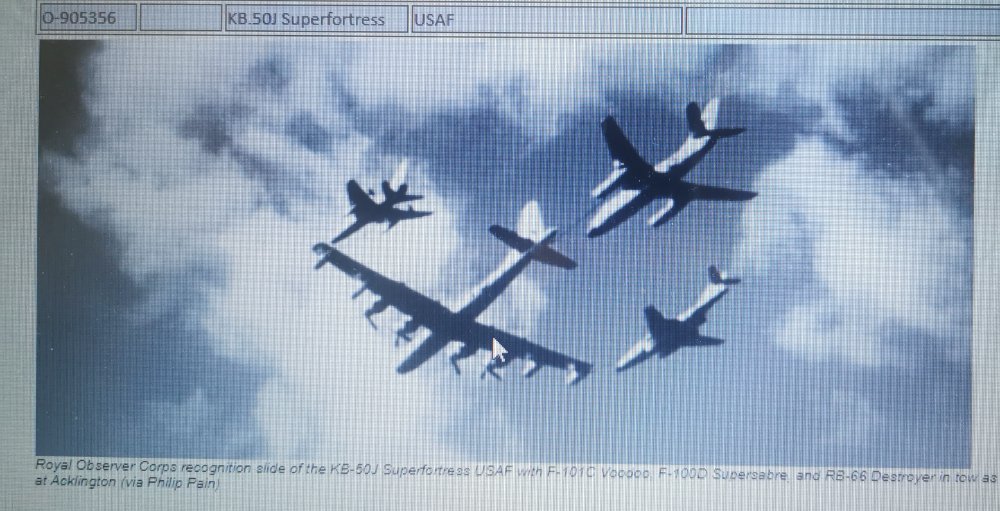 In the late 1950,s I had a sight that has stayed with me ever since. I was playing in the street in Newcastle where I was brought up when this large aircraft flew over at low level. (About 1500ft) trailing on each wing were two other aircraft. It turned out that the large aircraft was a KC-97 with ether two F100,s or F-101,s. I think there must have been an airshow at Aclington. So here's to memories.