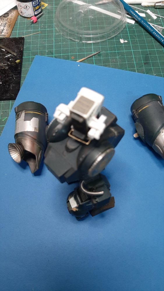 The 'head' had a full rebuild - I had it figured as a 'sighting and sensor' unit but decided to add a couple of close-in defence guns because I had some brass ones lying about. Rest of the model was dressed with bits of left over PE grilles etc and the flexible pipes came from an old heating element found in dad's old workshop. (never throw anything away!!)