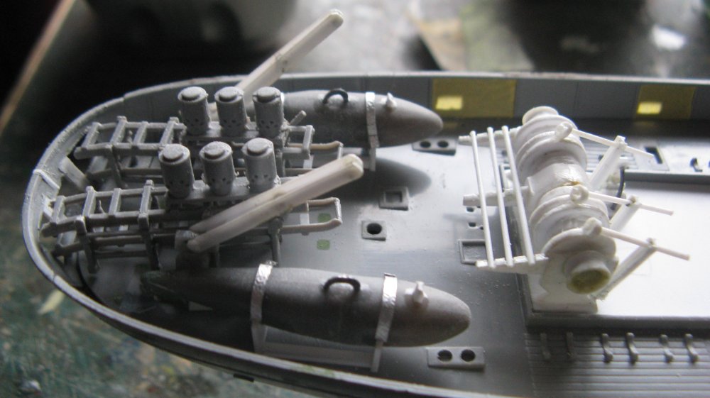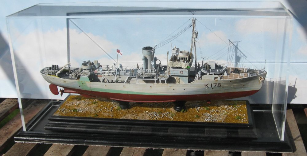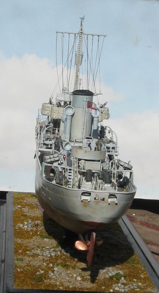 Always wanted to convert the Revell 1/144 Snowberry Corvette since it came out but had never built up the courage to start. I have made the 1/72 kit using “Flightpath,s” detail sets many years ago. (Still have it. HMS Bluebell) Found the L,Arsenal bridge set online so sent for that. In the meantime, glued the hull together and looking at photos and decided to take out some of the flare on the bows. Did this with a bit of plasti-card and milliput. Still not got the courage to cut the hull up so did some more research. Found an article by someone called “Captain Brown”. Lots of information on a 1/72 build. After reading through it decided to build the minesweeping gear before cutting into the hull as there were still options open to me without cutting. I used the winch gear left over from the Revell North Sea Trawler I'm converting to an Admiralty Class Trawler as the starting point The mine sweeping floats and lifting winches made next. Have decided to go along the lines of a Canadian Flower as the engine room casing is shorter so will alter the appearance from my HMS Poopy even further. Built the depth charge racks by thinning down the sides as I think I have made the Oropesa floats slightly too large. Opened a hole between the depth charge rack discharge holes for the mine clearing hawsers. Will make the guide rollers for the mine clearing hawsers next. DOH!!!! (Should have made the engine room casing first as now I have found that the minesweeping gear is too big so I,v consigned the minesweeping gear & floats the spares box. Now must do some hole filling I made in the stern.)