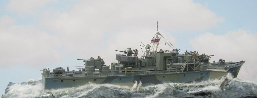 As for my water base I wanted rougher North Sea effects so a Sea-base was made using my cheap system using toilet tissue and white glue papier-Mache type sea, the boat was placed onto the base in the position I wanted after first adding masking tape to the hull to protect the paint and then the wake was built up using toilet paper and glue until I was happy with the effect. (The boat was then carefully removed). Once dry I sprayed the whole with “Halfords” grey primer (A number of coats was used to try to smooth out any pointy bits) but I still was not happy that it was smooth enough so used two coats of “Scenic Waters Water effects” to soften the water. Another coat of “Halfords” was now used as a base for the Humbrol enamels as the main colours. (Humbrol 104 blue as the main colour followed by using a small amount of Humbrol 105 green and a touch of yellow blended into the blue while still wet, from the base of the waves towards the top to start creating the effect of a cold rough sea. This was followed by a coat of “Future” to seal and protect to enamel paints. Now it was time to create the whiteish wave tops and any water movement by using oil paints. (it's the oils that really bring on the moving sea effect). I then fix the hull to the base to minimise handling the boat and then all the deck fittings are added. (Which is still ongoing). Once the boat is fixed to the base it will be blended in using cotton wool to represent the boats wake. This is done by painting on “Future” to the places I want to show water spray and then sticking cotton wool quite generously to the “Future”. Once really dry I then start pulling off any access cotton until I'm happy with the scene.