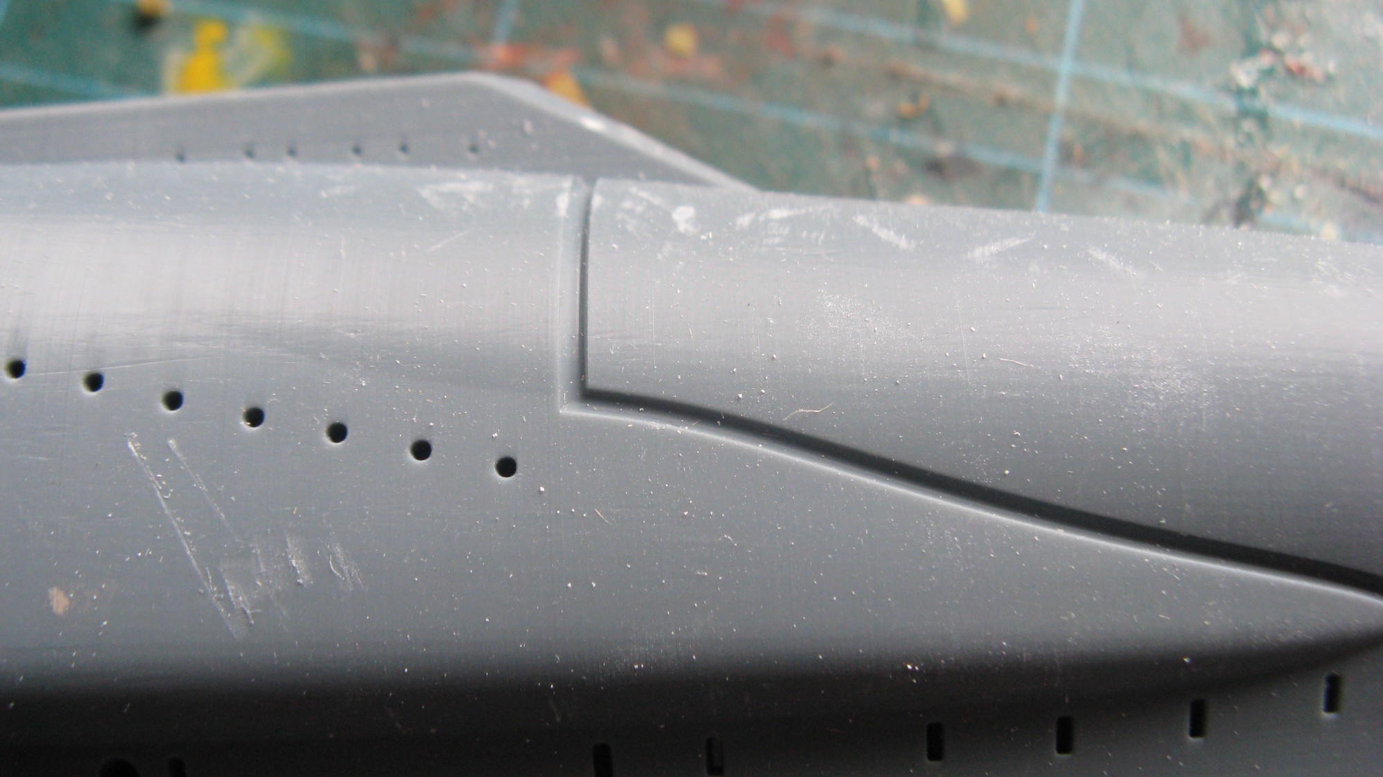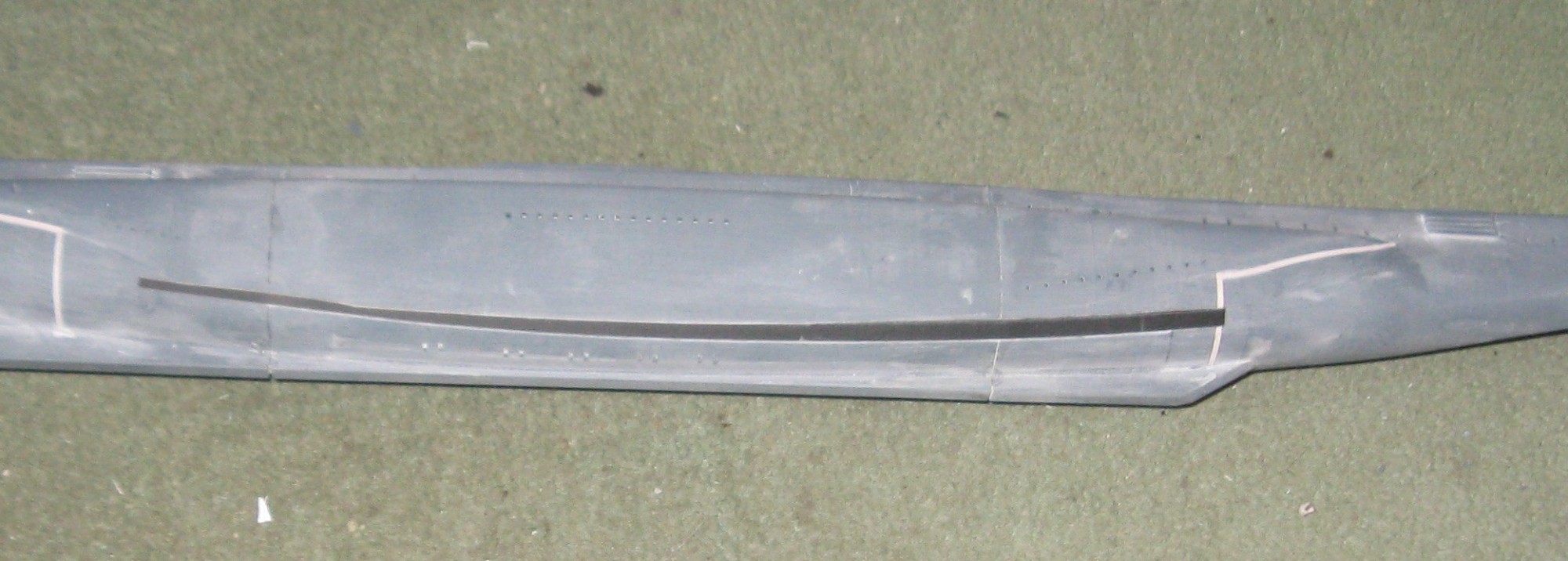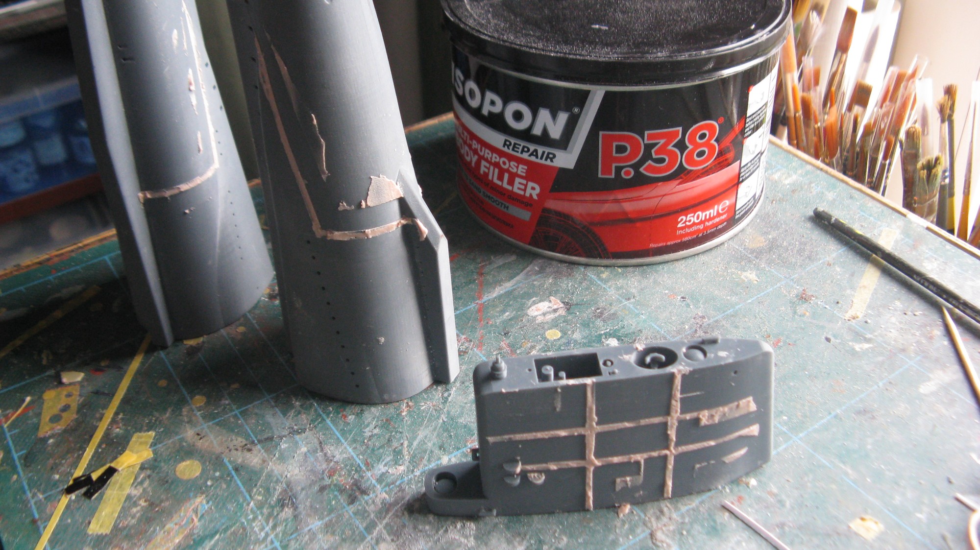 There are some really deep trenches on the hull but more particularly on the conning tower/fin. These were filled using car body filler before adding some panel line detail.